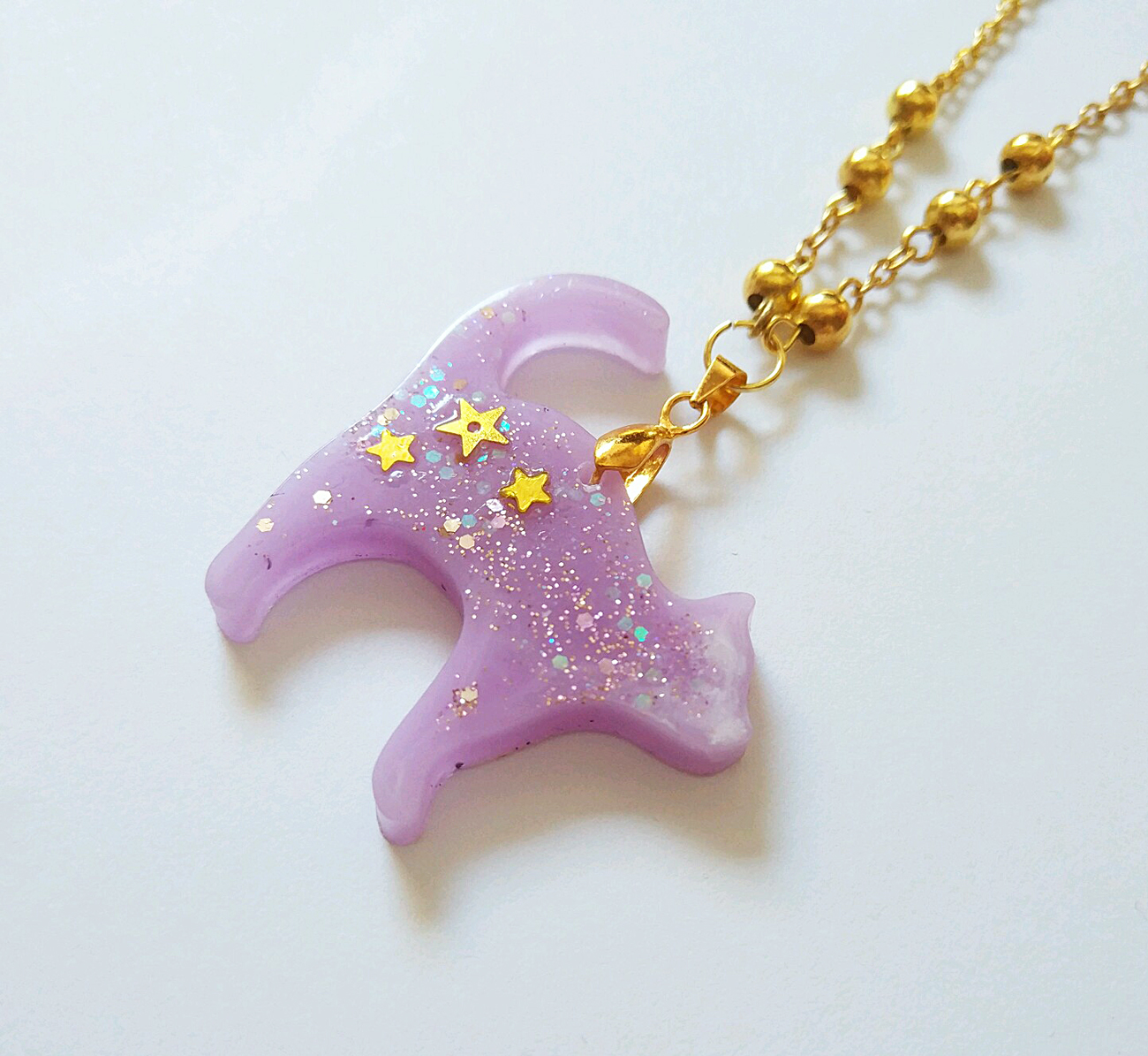 Handmade lavender resin cat and glittery stars.