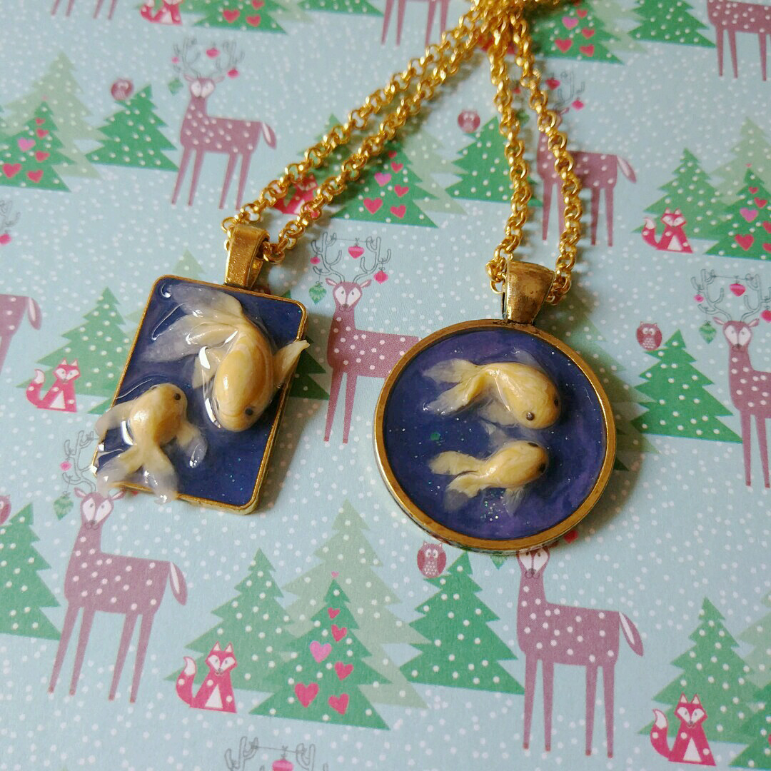 Golden bezel holding two goldfish inside the water resembling the dark sky.